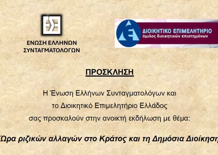 Το ΔΙΟΙΚΗΤΙΚΟ ΕΠΙΜΕΛΗΤΗΡΙΟ σε συνεργασία με την ΕΝΩΣΗ ΕΛΛΗΝΩΝ ΣΥΝΤΑΓΜΑΤΟΛΟΓΩΝ ξεκινούν τη δημόσια συζήτηση για τις αλλαγές που απαιτούνται στον χώρο του Κράτους και της…