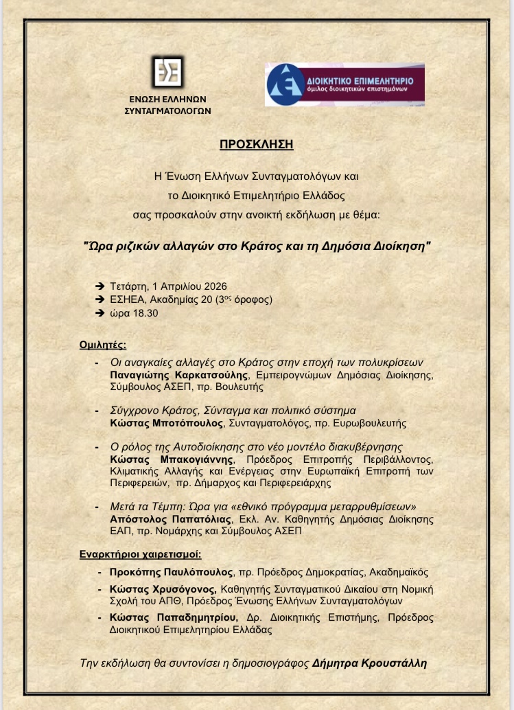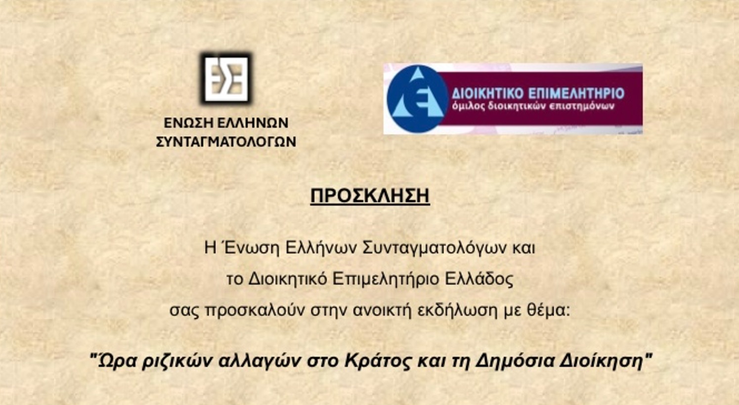 Το ΔΙΟΙΚΗΤΙΚΟ ΕΠΙΜΕΛΗΤΗΡΙΟ σε συνεργασία με την ΕΝΩΣΗ ΕΛΛΗΝΩΝ ΣΥΝΤΑΓΜΑΤΟΛΟΓΩΝ ξεκινούν τη δημόσια συζήτηση για τις αλλαγές που απαιτούνται στον χώρο του Κράτους και της Δημόσιας Διοίκησης. Η πρώτη σχετική εκδήλωση διοργανώνεται την Τετάρτη, 1 Απριλίου, στην Αθήνα, στην Ενωση Συντακτών Ημερησίων Εφημερίδων Αθηνών (ΕΣΗΕΑ), στις 18.30μμ την οποία θα χαιρετίσει ο π.Πρόεδρος της Δημοκρατίας καθηγητής Προκόπης Παυλόπουλος. Η εκδήλωση θα μεταδοθεί και δικτυακά από τους ιστοτόπους του ΔΕΕ στο FaceBook και το YouTube με σύνδεσμο που θα σταλεί-ανακοινωθεί τις επόμενες ημέρες.