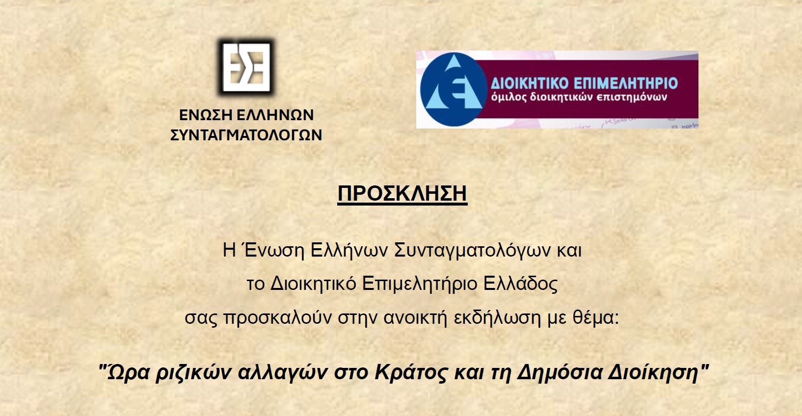 Σας αναμένουμε στην κοινή εκδήλωση Διοικητικού Επιμελητηρίου και Ένωσης Ελλήνων Συνταγματολόγων, η οποία θα διεξαχθεί στις 29 Απριλίου, ώρα 18.30-21.00μμ, στην αίθουσα του 1ου ορόφου της Ένωσης Συντακτών Ημερησίων Εφημερίδων Αθηνών (ΕΣΗΕΑ, Αθήνα, Ακαδημίας 20), με θέμα: “Ώρα ριζικών αλλαγών στο Κράτος και τη Δημόσια Διοίκηση“.